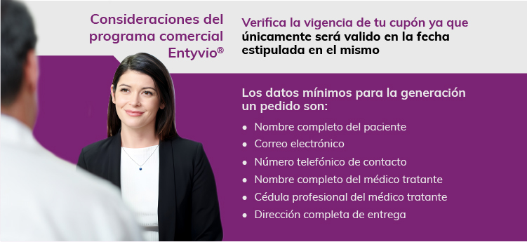 *Válido un cupón por paciente. Este programa comercial es patrocinado por el laboratorio Takeda México S.A. de C.V. El programa comercial de Entyvio® intravenoso de Takeda puede ser finalizado por Takeda en cualquier momento sin previo aviso. Servicios Farmacéuticos Especializados es el proveedor autorizado por Takeda para ejecutar el Programa Comercial de Entyvio® intravenoso. No. de registro sanitario, Entyvio® SC: 235M2022 SSA IV No. de registro sanitario, Entyvio®: 304M2018 SSA IV. Para reportar algún evento adverso envía un correo a: AE.BRASAM@takeda.com