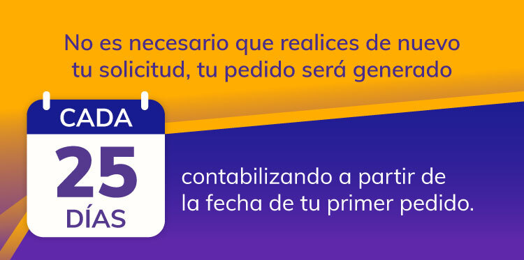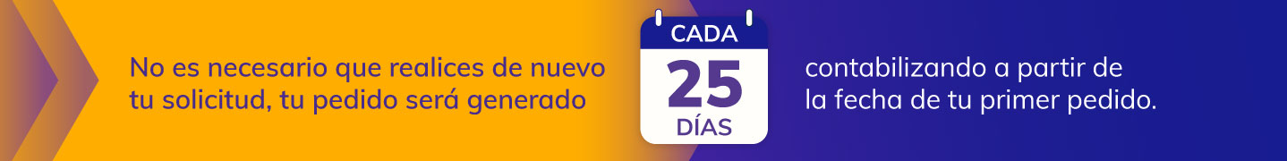 Al generar tu pedido, selecciona la opción de suscripción y elige la periodicidad en la cual requieres el medicamento. Al tratarse de una suscripción, estas aceptando que se realice un cargo recurrente según la periodicidad que hayas elegido.